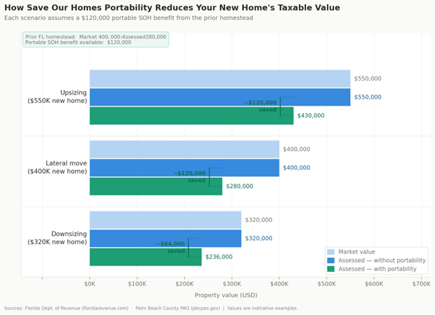 Palm Beach County’s portability page says Florida’s Save Our Homes provision allows owners to transfer all or a significant portion of that tax benefit, up to $500,000, from one qualifying Florida homestead to another.