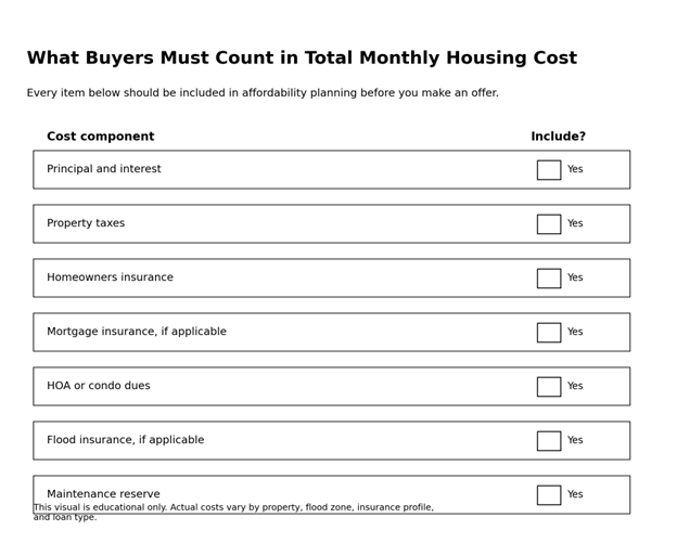 Add together principal, interest, property taxes, homeowners insurance, mortgage insurance if applicable, HOA fees, flood insurance if applicable, and a cushion for maintenance or future fee changes.
