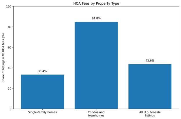 Nationally, Realtor.com reported that the share of U.S. listings with HOA fees rose to 43.6% in 2025, with the median monthly HOA fee rising to $135 from $125 the year before. It also found that roughly one-third of single-family listings had HOA fees, while more than four in five condo and townhome listings did.