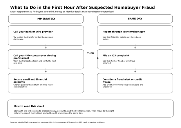 Disclaimer: This article is general education, not legal, tax, cybersecurity, or financial advice. Fraud tactics change often, and your lender, title company, attorney, bank, and law enforcement contacts may give case-specific instructions. Always follow verified instructions from the professionals handling your transaction.