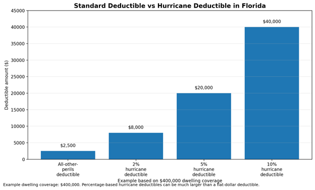 Florida homeowners often have a flat-dollar deductible for most covered losses and a separate hurricane deductible for hurricane losses.