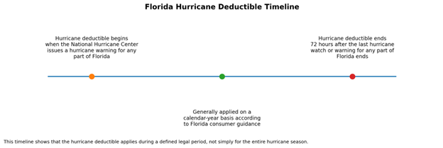 In Florida, the hurricane deductible applies only during the legally defined hurricane deductible period.
